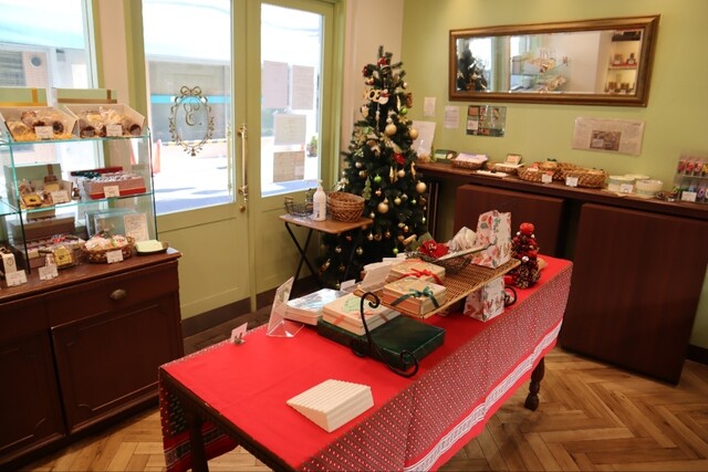 四方に焼菓子棚が広がり、中央に煌びやかなケーキショーケース。