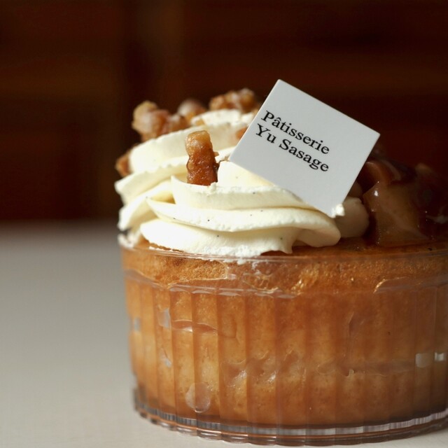 カルヴァドスに浸したババに、カスタードクリームとリンゴのキャラメリゼ。