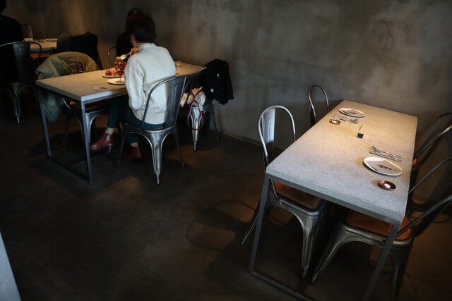 コンクリートビルな外観で、店内もシルバーのコンクリ構造。