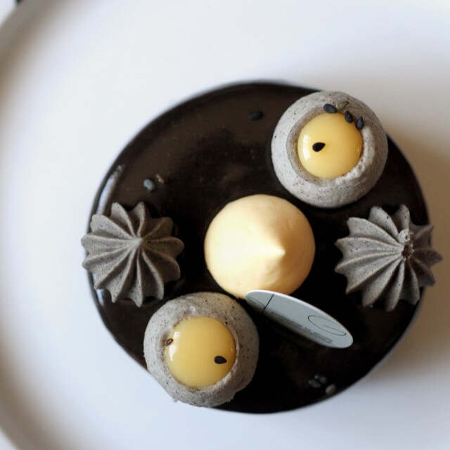 ゴマのプラリネクリーム・ベルガモットジュレとグレープフルーツのコンフィ。