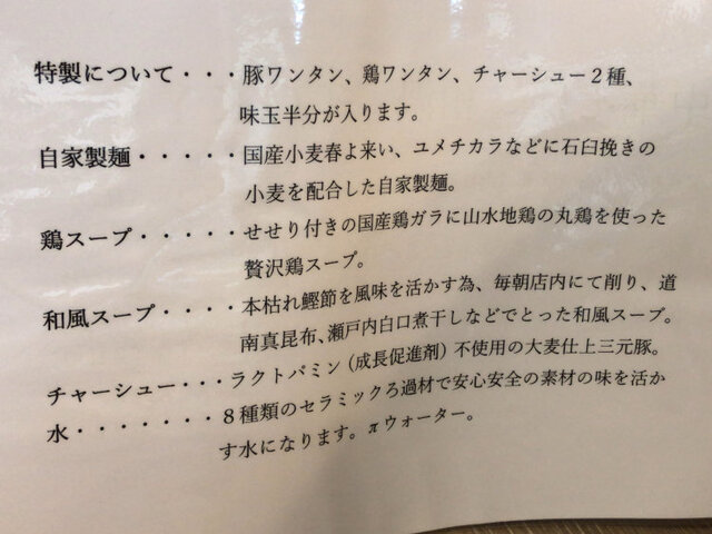 ・特製のチャーシュー四枚、豚ワンタン、鶏ワンタン、穂先メンマ、味付け玉子付きで1,000円は素晴らしいコスパ。