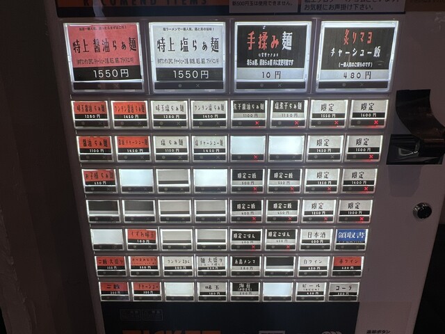 面白いのは手もみ麺に変更すると+10円。自分は特上醤油+手もみ麺の食券を購入し1,560円でした。