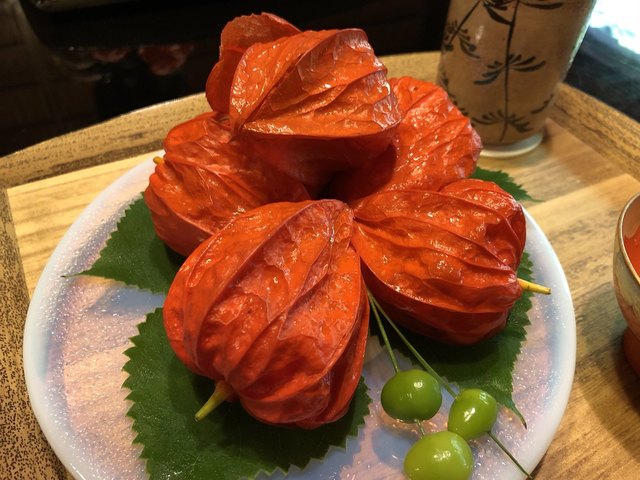 八寸はほおずきの中にいろんなものが入っています、蓋物はなすの器が素晴らしい、水物の抹茶かき氷は濃厚でした