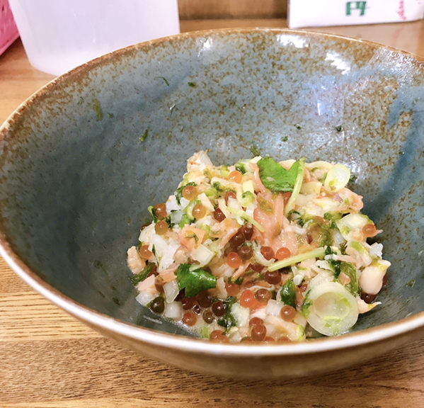 燻製サーモンとイクラと生海苔の山葵和え麺〜飯割付き〜