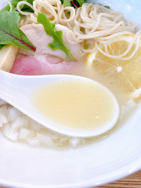 粘度低めなサラサラ鶏白湯で綺麗に白濁、臭みけしで生クリームを使ってるそうで