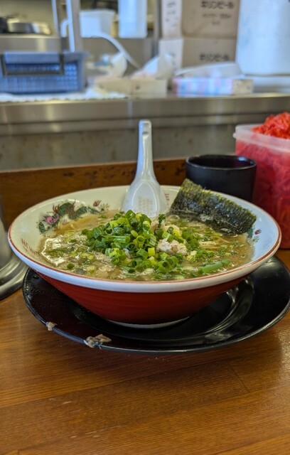 一番ノーマルでシンプルなラーメンで、乳茶色のスープに海苔と青ネギ、それに肉っぽい何かが載っています。お久しぶり。