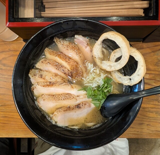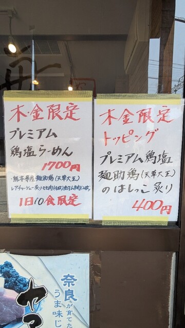 着席してから念の為、木金のみ10食限定で提供の「プレミアム鶏塩らーめん」1,700円税込がまだ残っているか尋ねたところ、不揃いなお肉で良ければ提供できるとのこと。それはラッキー。迷わずお願いです。