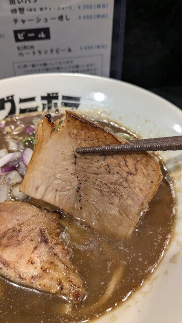 メインのトッピングには炙ったチャーシューが2枚。肉厚でしっとり香ばしく、歯ごたえしっかり系の美味しいチャーシューです。