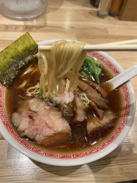 薄い油で蓋をされた熱々のスープは、煮干しの香りが立っていますが、動物系の出汁でまろやかになり、キリリとした醤油が、やや細目のストレート麺に絡まり、見た目を裏切る?感動の美味しさでした。