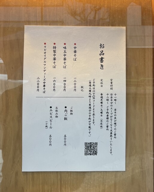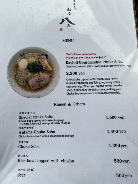 休日14時30分からの予約でしたが、14時10分頃店に着くと、スタッフさんがメニューを渡してくれたので、数量限定のラビオリグルマンディーズ中華そばがまだあることを確認して注文しました。