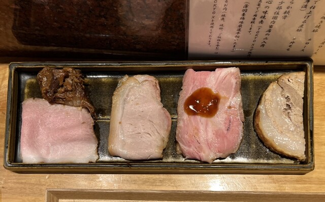 脂身まで甘くトロトロの豚バラ煮豚、旨みの詰まった肩ローストレアチャーシュー、香ばしい吊るしロース焼豚、絶妙な味付けのもも肉醤油煮、柔らか軟骨は、どれも飲み込むのがもったいないほどの美味しさでした。