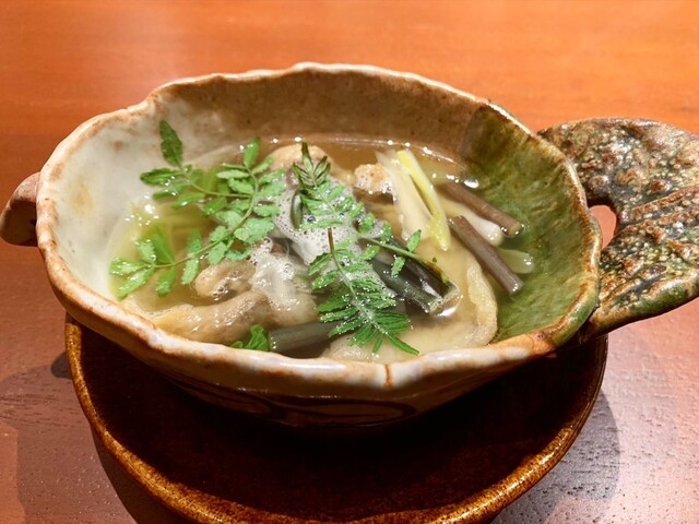 ◇鯉の丸仕立てを日本酒で煮詰めたお出汁にワラビとこごみを一緒に