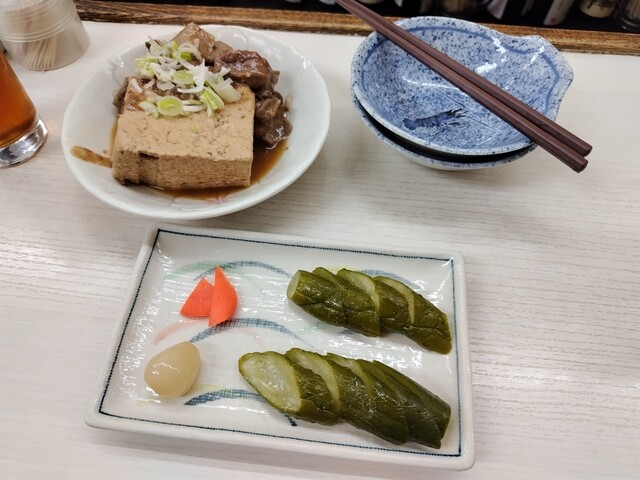 ツマミは「煮込み豆腐」「お新香」にて。