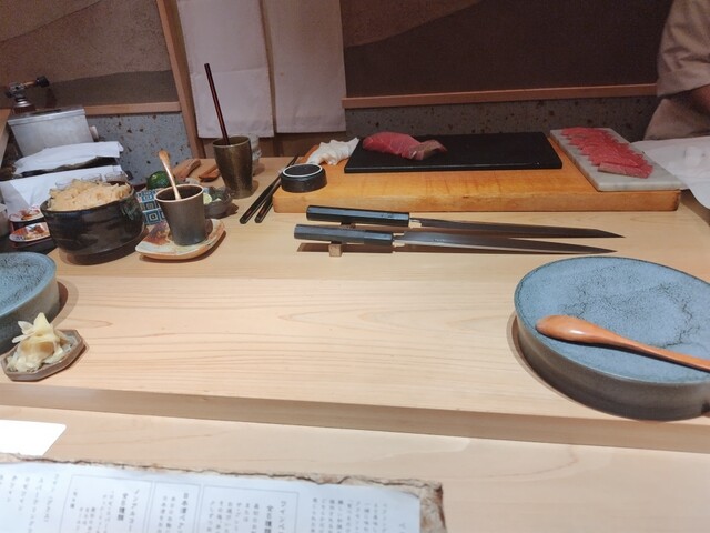 店内入ると、カウンターの向こうに、すでに美味しそうな鮪が準備されてます。(^^)