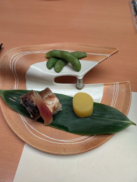 カマスの小袖寿司、蒸し物と揚げ物も来ました。この時点でおなかいっぱいです〜