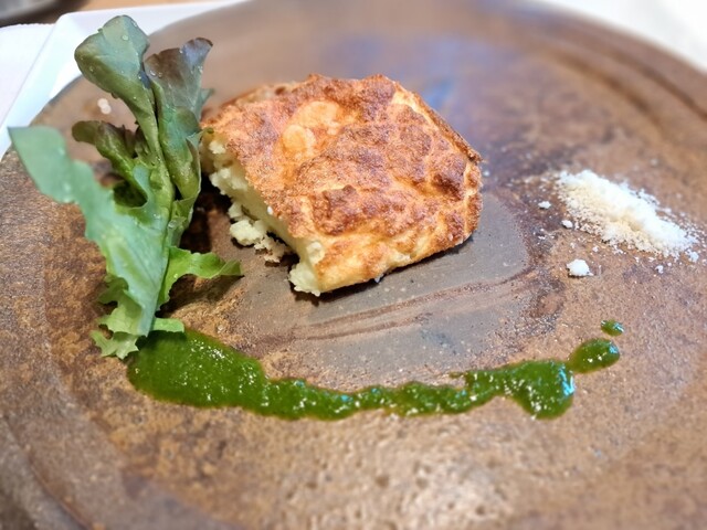 三皿目はズワイガニとジャガイモとパルミジャーノのスフレ。熱々で提供されました。外側は香ばしくうっすら焼き色が付いています。バジルのソースとパルミジャーノを絡めています。