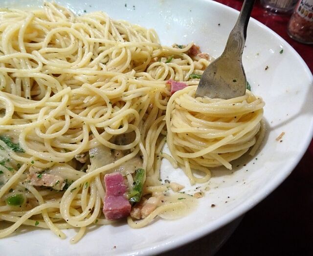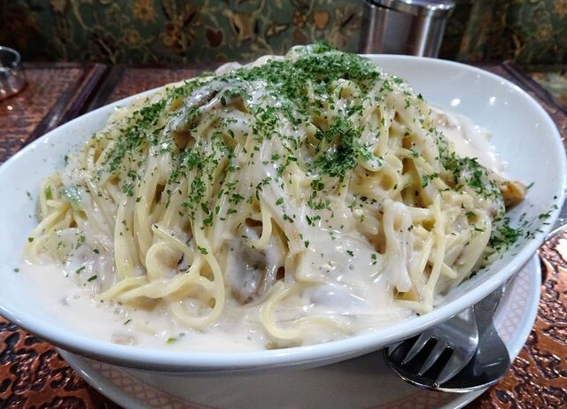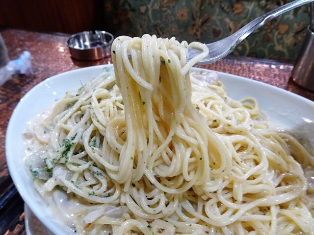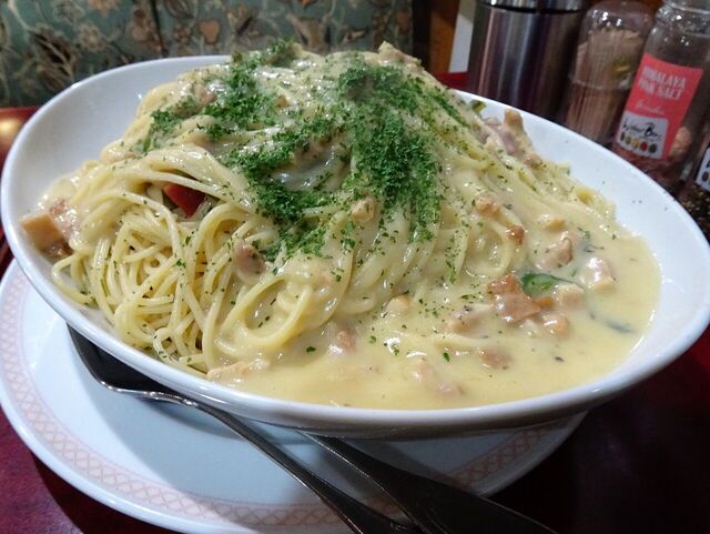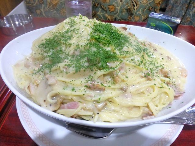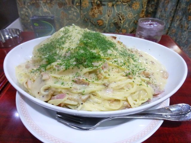 小伝馬町の「アーモンド」で、デカ盛り明太子クリームスパゲッティ!