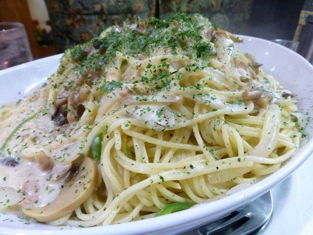 盛り付けた、デカ盛り和風きのこスパゲッティ!