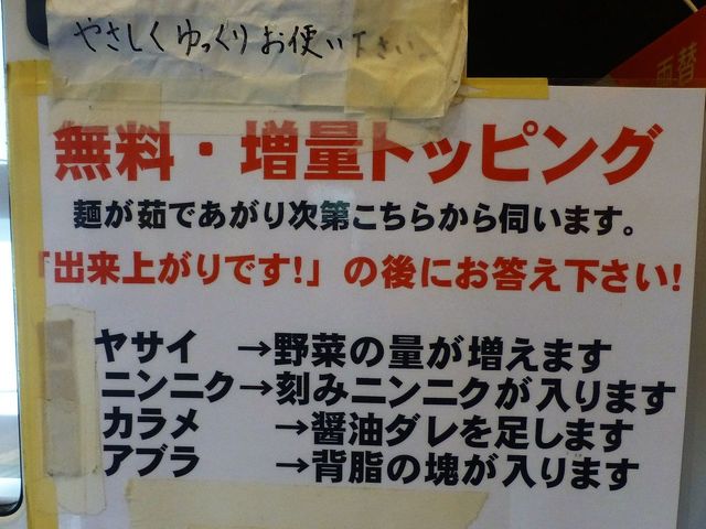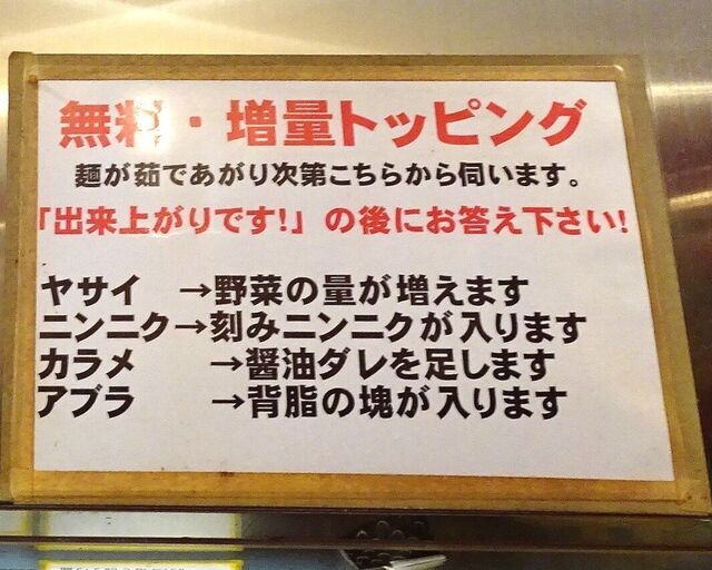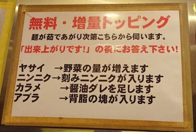 (ヤサイ、ニンニク、カラメ、アブラ、あげ辛、削り節)