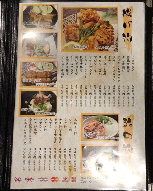メニューは、刺身、揚げ物、天ぷら、焼き物、