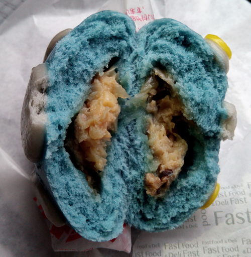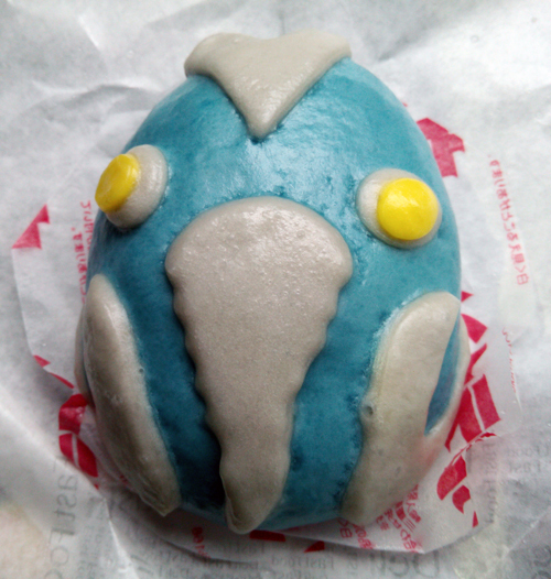 ゆるキャラにデザインされたバルタン星人。色は水色主体で毒毒しいですがぱかっと開けると普通の肉まんです。普通においしいですよ。