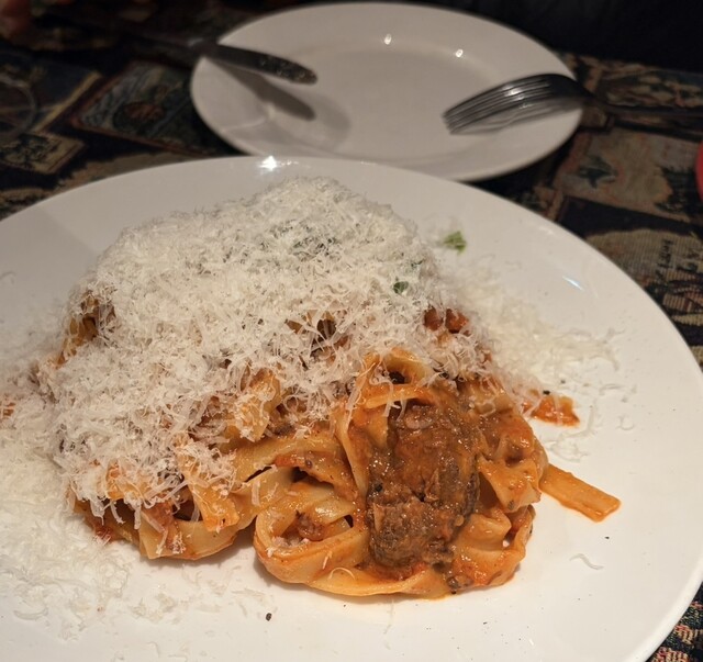 パスタは手打ちのフェトチーネに牛すじ肉の赤ワイン煮トマトソース、チーズを卓上でたっぷりかけていただいて。