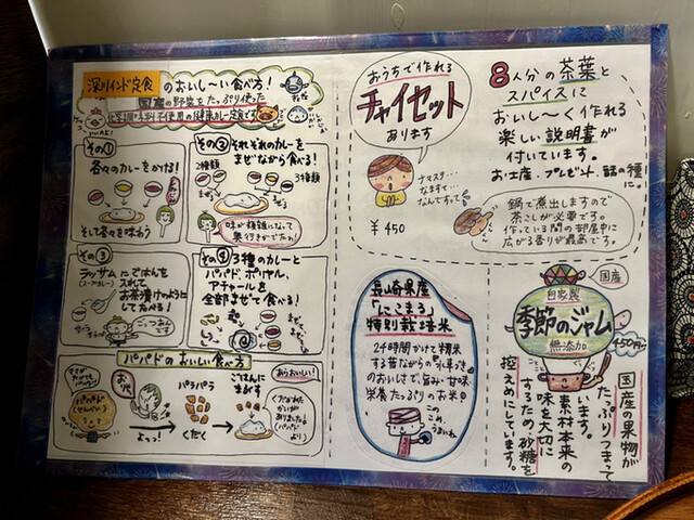 店内は入って右側の壁沿いにカウンター5席。左側に厨房というレイアウト。店主の方と思われる男性と奥様と思われる女性の2名体制。内装はDIY感溢れる素朴な雰囲気。メニューや食べ方説明などに書かれているイラストも可愛らしい。