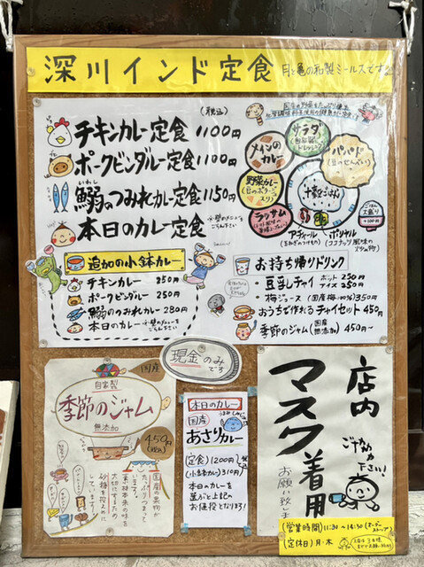 こちらは2021年開業のカレーの店。「深川インド定食」と銘打って、和と南インドのテイストをミックスしたミールスを提供している。