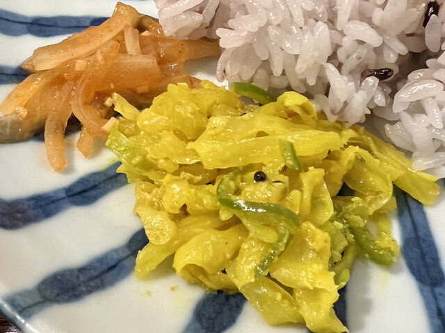 平皿に十穀ごはん、パパド、キャベツとピーマンのボリヤル、玉ねぎのアチャール。左からラッサム、野菜カレー、鰯のつみれカレー、サラダの小鉢が4つ並んでいる。食器は全て和風テイスト。