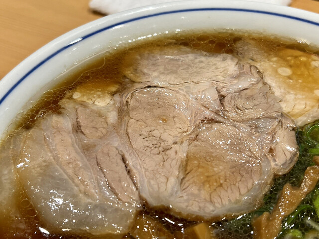少し大きめの丼になみなみと入った醤油色のスープんいほぼストレートの中細麵。具は豚もも肉チャーシューと豚肩ロース肉チャーシューが2枚ずつ、ワンタン2個、味玉、細裂きのメンマ、海苔、小口切りの青ねぎ。