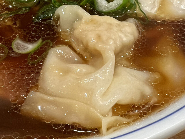 ワンタンの餡はかなり大きめ。ねぎ(ねぎ油かしら?)が仕込んであって、餡が口の中で解けるとフワッと香る。皮はちょっともったりとした感じ。