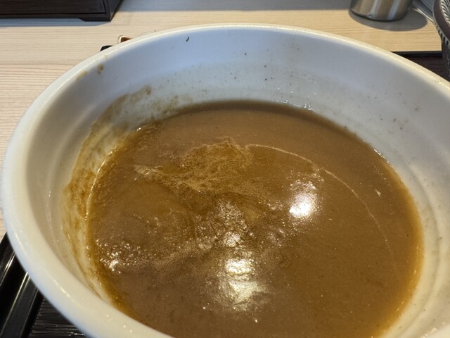 つけ麺のスープ割り、聞いたことあるぞ、入れるんだよね。入れたよ、美味しい。これは良き!熱々復活。完飲したいけど時間が足りず、終了。