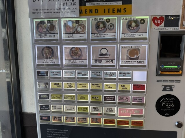 前回、携帯を持たずに伺いましたので写真撮影と、美味しかったのでもう一度という訪問でした。13:50にお店さんに着。前のお客さんが時間をかけて券売機を利用されており、都合3分待ち。券を購入後も、お客さんがいっぱいで、7~8分ほど外待ちをしました。今回はお一人様より2人で来ている方が主でした。