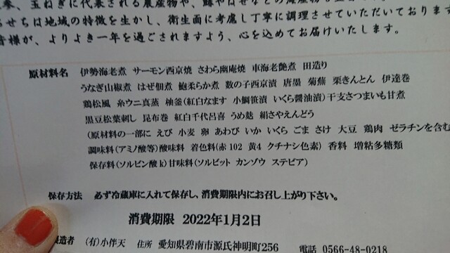 おせち一段 ふるさと納税25,000円 外箱は白木故にちとシミが(笑)でも、裏白が蓋に挟まっちゃった高級なシミです ( ^-^)ノ∠※。.:*:・'°☆