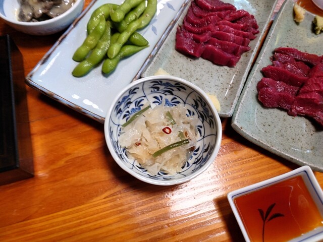 馬刺しの上×2人前、馬肉メンチ、馬肉チョリソー、生姜と馬肉を煮込んだ大和煮、馬肉のぬた、きくらげの酢の物、枝豆をいただきました。
