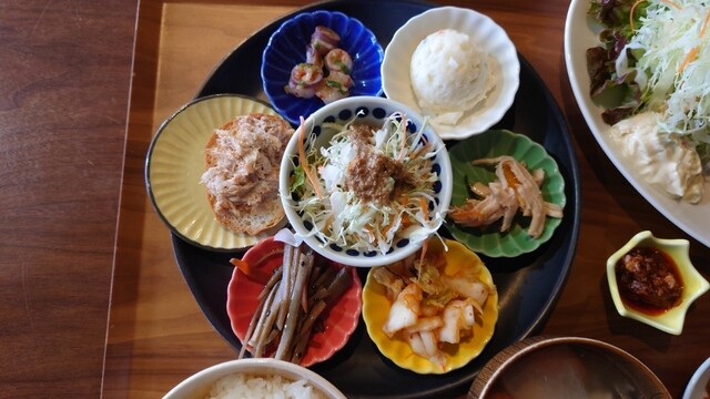 棒々鶏、キムチ、きんぴらごぼう、豚肉のバケット、タコの煮物、ポテサラ、コールスロー。