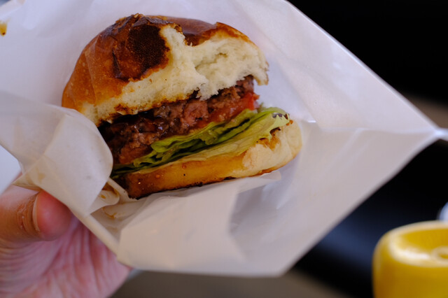 お目当てのバーガーは娘の好みで照り焼きバーガーにしたのですが、肉の味を邪魔するような甘味のしつこさはゼロ。パティの基本の味付けは塩のシンプルストロングスタイル。大好きな宮崎県の名店『Good Days』に似た系統で好みでございます。胡椒やスパイス、ケチャップで雰囲気を出すバーガーはそりゃ美味しいですけど、食べたいのはそれじゃない。こちらのバーガーのファーストバイトで感じた印象は「食い切れるように挽肉にしているだけで、ああこりゃステーキだ」というものでした。