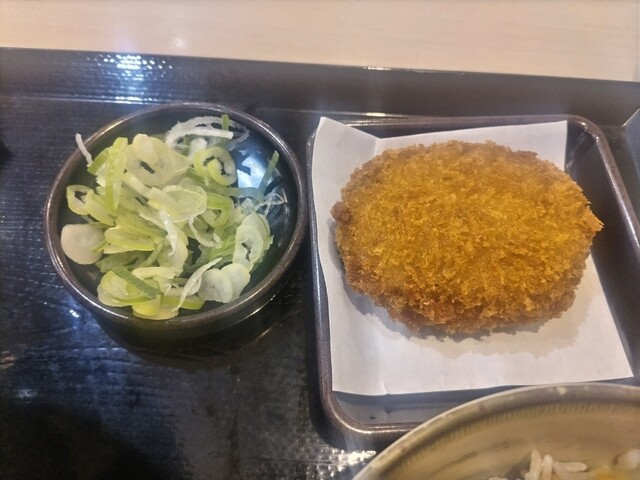 野菜かき揚げ朝定 480円にクーポン無料のコロッケ