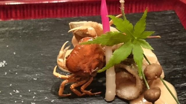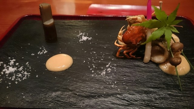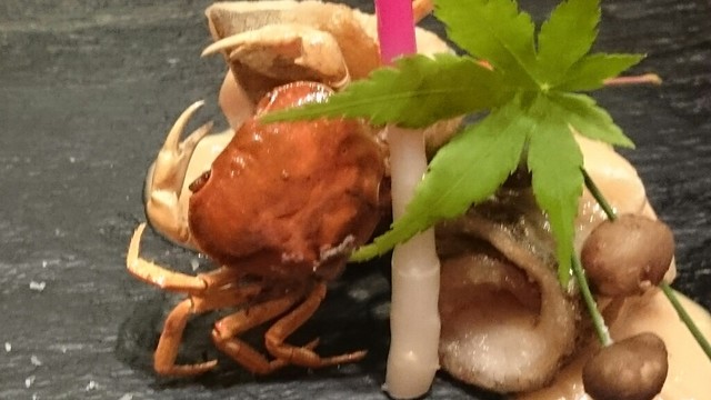 ◎続いて山水の芸術品のような一皿✨~沢蟹を頂きますと、解禁になったばかりの鮎が幽庵焼きで…蟹はサクサク、鮎ほわほわ!~あぁっ!、美味しゅうございます❗