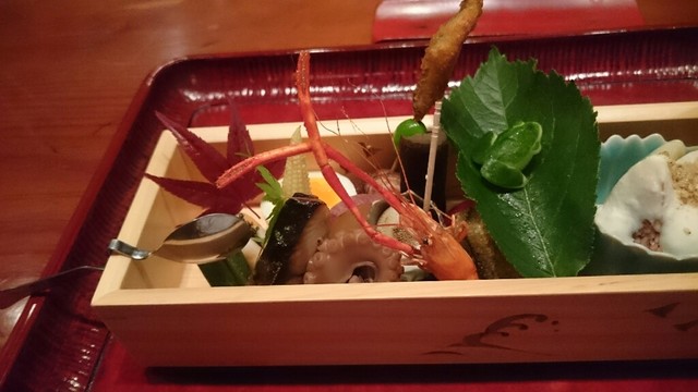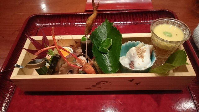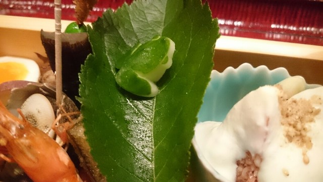 ◎八寸、これは味の宝石箱や~✨箱の中にもなんと、胡瓜の蛙が!桜の青葉に乗って登場❤