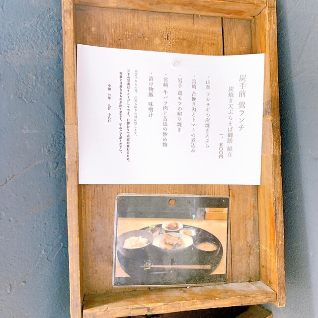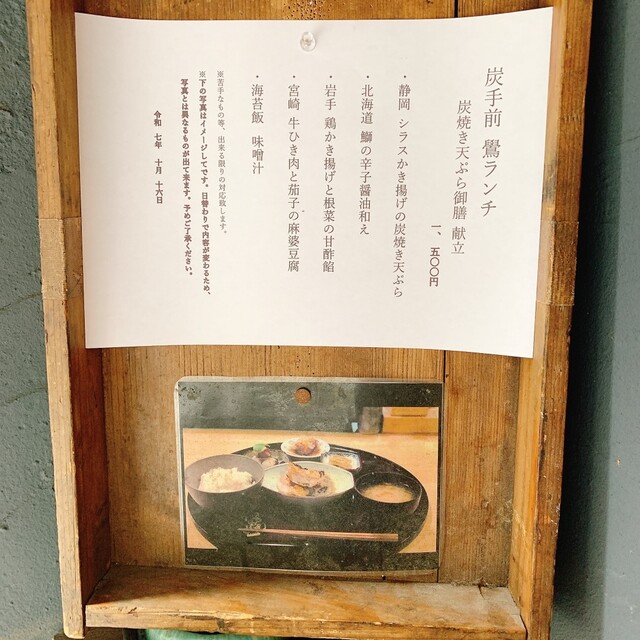 ランチは炭焼き天ぷら御膳(1500円)のみで、毎日日替わりです。