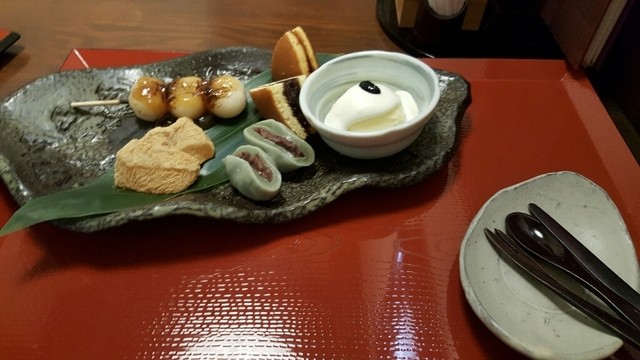 (お団子1本、どら焼1/4に切ったものが2つ、麸まんじゅう、アイス、わらびもち)