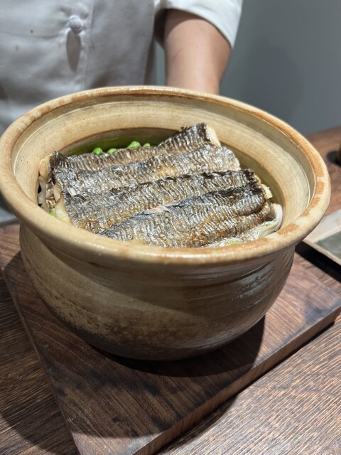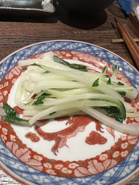 三品目は太刀魚と枝豆の炊込みごはんに、中華らしく気仙沼産ヨシキリザメのフカヒレあんかけを掛けて頂く、贅沢な炊込みごはんでした。炊込みご飯はしっかり太刀魚が感じられフカヒレのあんが包込み美味しく頂きました!フカヒレ自体もうまうまでした。添え物の広東白菜はほぼ炒めただけのシャキシャキ感が良く合いました。