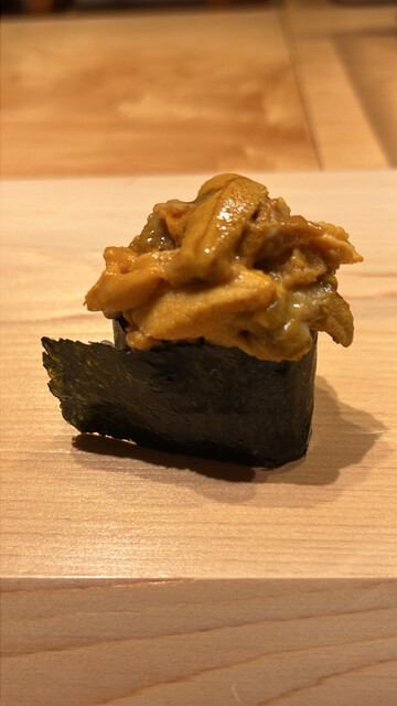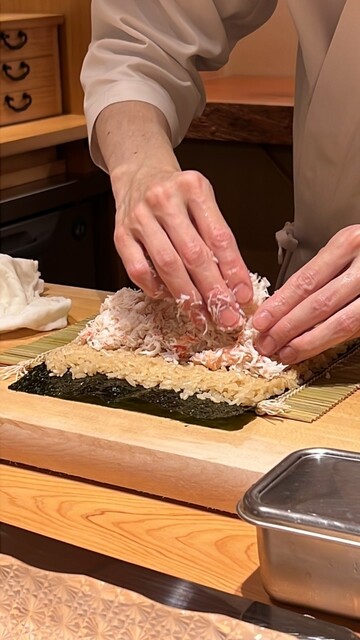 →大分の赤ウニ。季節的に最後とのこと。濃厚で旨みたっぷりな味わいながらくどくなく爽やかで絶品。ほぐした鮎とピリッと爽やかな花山椒を和えた逸品で旨し。口の中が蟹で一杯になる程、蟹だらけの巻物に、塩味あるいくらの旨味が相まって口中幸甚。自家製唐墨も塩辛過ぎず、ねとっとした旨味が旨し。