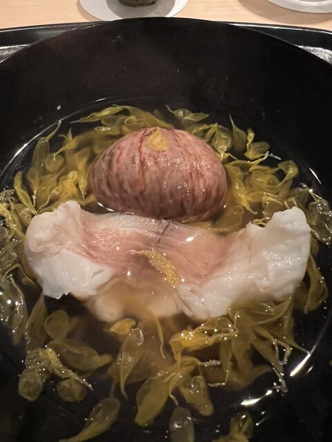 →脂ののったキジハタは口の中でほろりととろけ、かなり大きな渋皮栗は上品な甘さで菊の花がアクセントのお吸い物によく合い素敵な逸品でした。