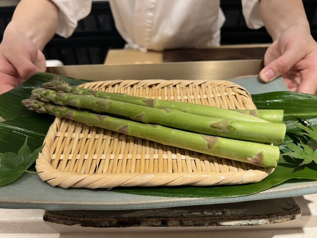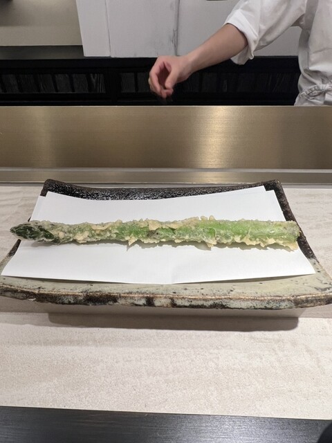 →一品目と同じ函館ジェットファームのアスパラガス丸々一本の天ぷら。頭の先から根元まですじもなく柔らかく、アスパラの出汁が染み出す旨うま天ぷらでした。