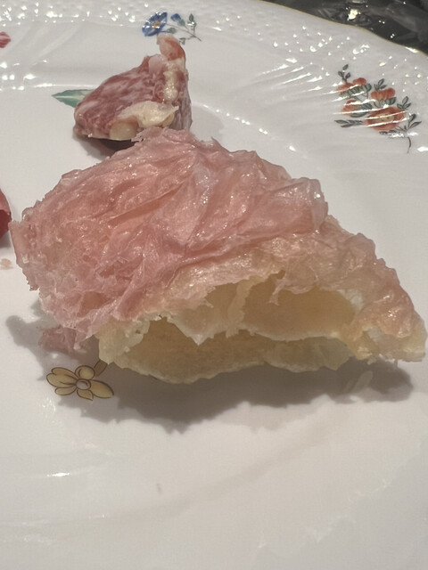 →入口にどっしり構えているスライサーで薄く綿のようにスライスされた生ハムをイタリアの揚げパン・ニョッコフリットにのせて生ハムの塩味で旨しでした。