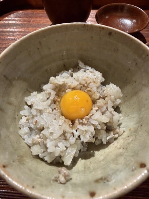 →焼けた薪が1本入ったおひつは壮観でした。鶏そぼろと出汁の旨みが合わさり、味変にて美味しく頂きました。