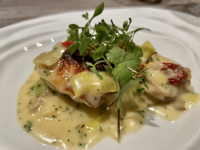 予約確認の電話をお店から頂いた際に、新店舗は元々のお店からビルを回り込んだ横にあると言われ、案内通りに行くと半地下の空間にオープンキッチンと白いレースカーテンで間仕切られたテーブルと、とてもお洒落な空間が広がり、食べる前からおのずと気分が盛り上がってくる。