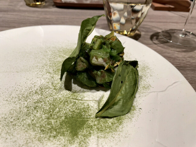 ◎ 青森産ヒラメのマリネ 鹿節・小松菜・筍と小松菜パウダー和え ...緑・緑・緑!見た目にセンセーショナルで、まさに葉っぱをかき分けながら探検…その先で出会うお味に大興奮!個人的には、「今日イチ!」の素晴らしい一品で感動した